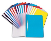 Flat files A4 with transparent cover, 2 prong metal mechanism with plastic compressor bar, comes in two different hole distances, full length title stripe.
